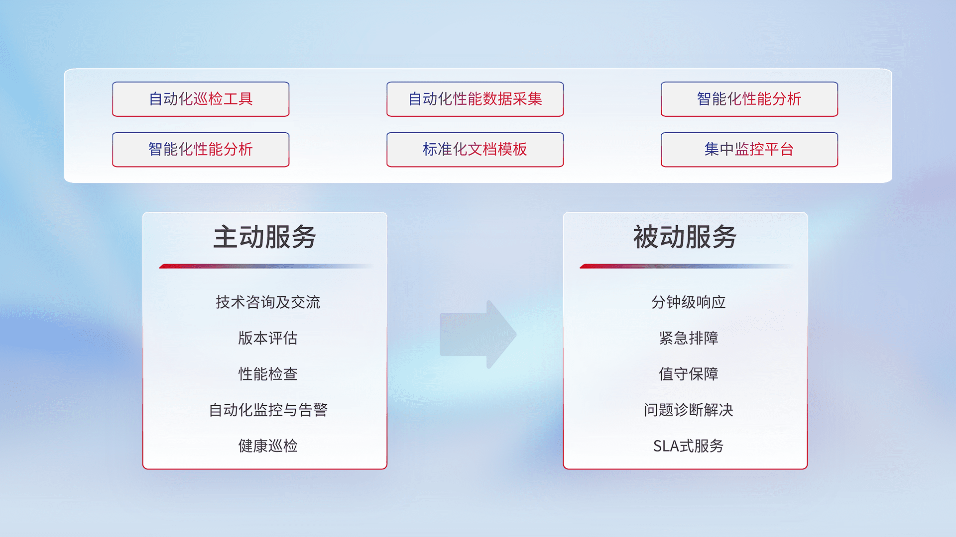 智能化工具和标准化文档,,保障服务质量,,提供主动服务(包含技术咨询、、、版本评估、、性能检查、、、自动化监控与告警、、健康巡检)和被动服务包含(分钟级响应、、紧急排障、、值守保障、、、、问题诊断解决、、SLA服务)。。。。