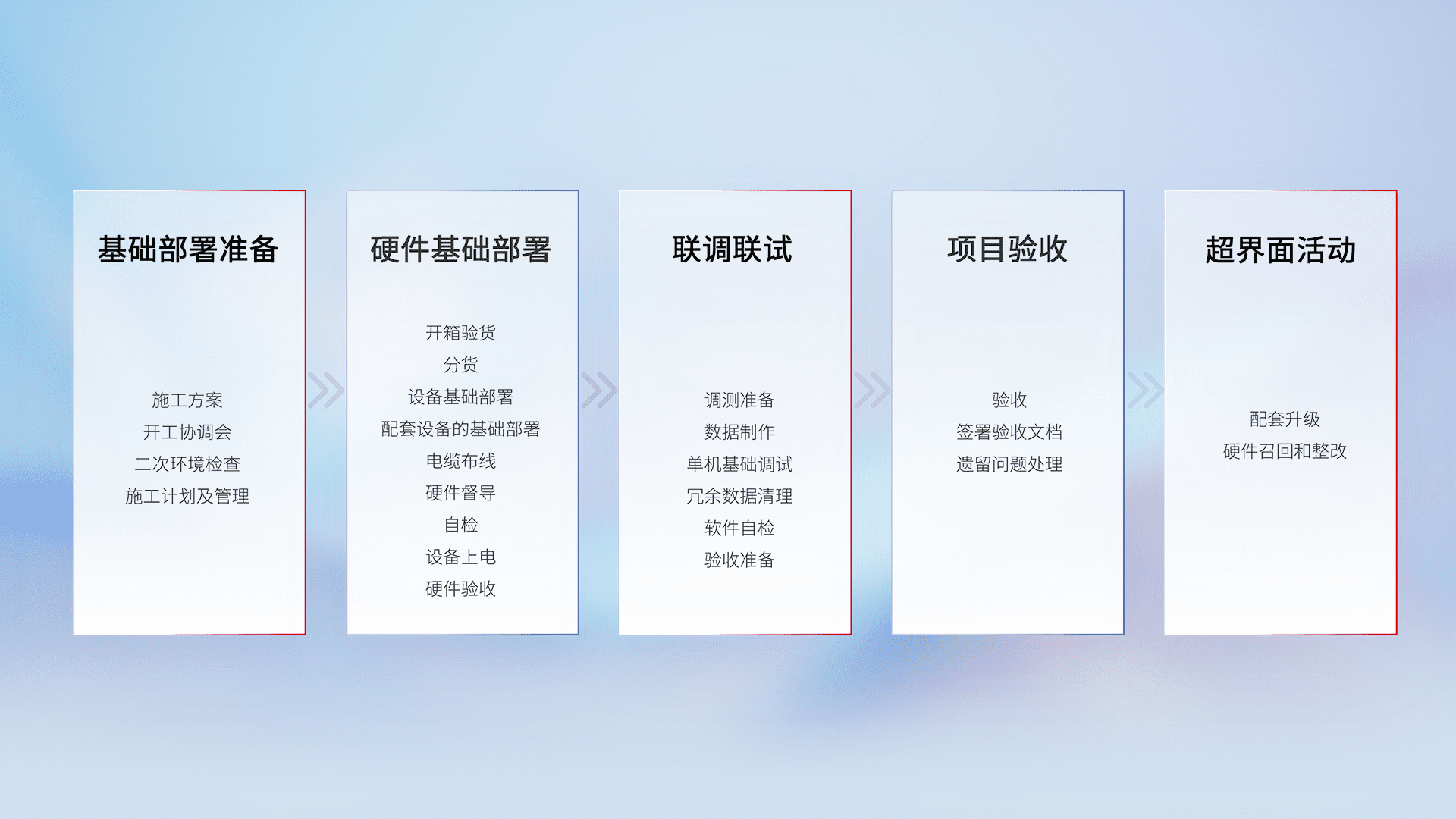 从基础部署准备、、、、硬件基础部署、、、、联调联试、、项目验收、、、、越界面活动的全过程可追溯,,,保证施工质量和进度。。